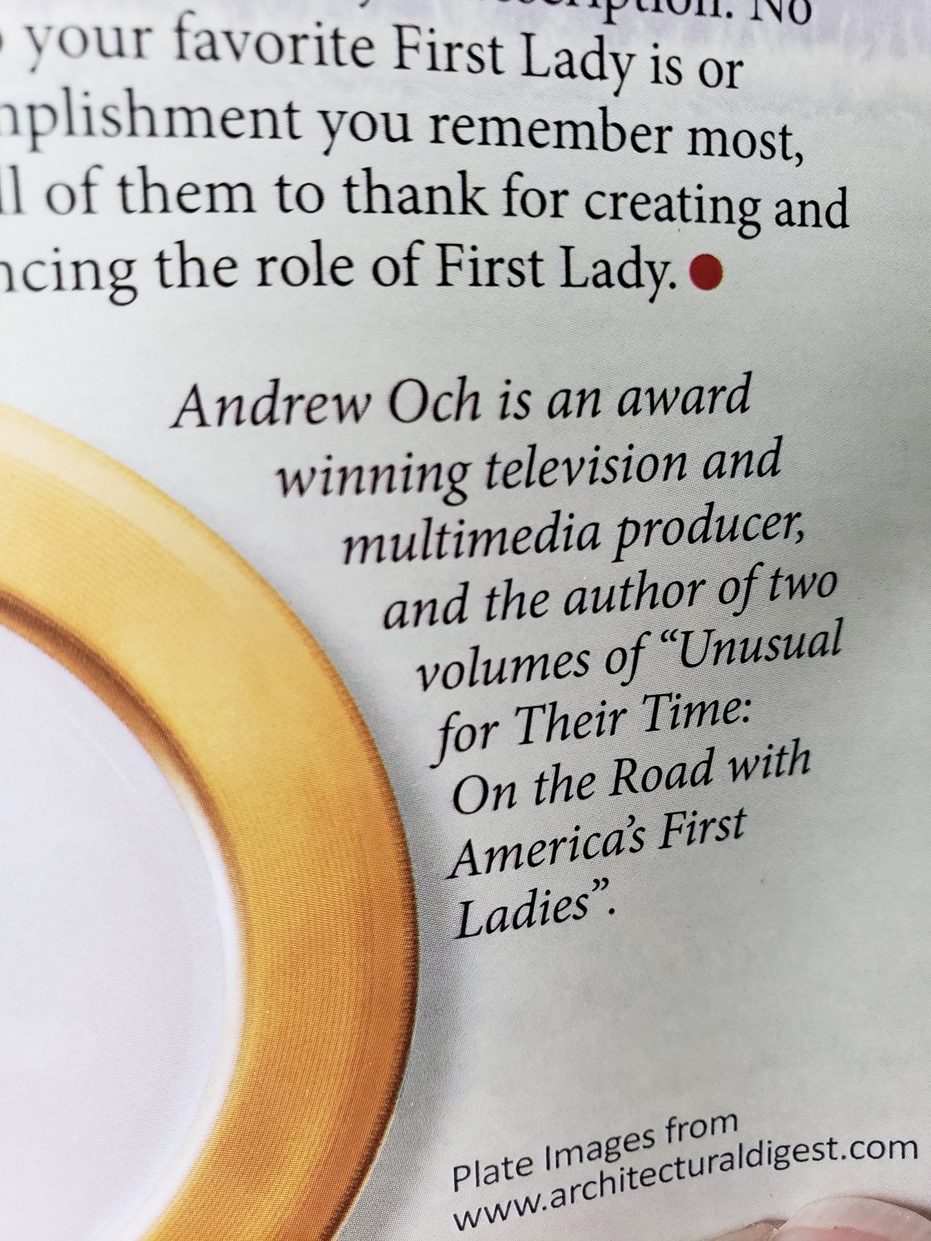 Andrew Och is the FIRST LADIES MAN and author of "Unusual For Their Time: On the Road with America's First Ladies" (Volumen One & Volumen Two). He is an award-winning television andmultimedia producer who has traveled the world with his pen, paper and camera. A Raio/Television and Film graduate from the University of Maryland, Andrew has been a storyteller, musician and entertainer from a young age. He enjoys the art of communication, and will go anywhere in the world for more knowledge, greater understanding, and amazing stories. He is a true docummentarian of life.