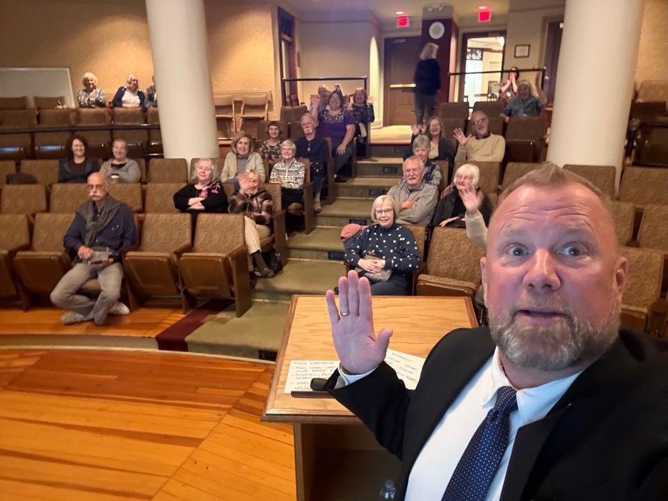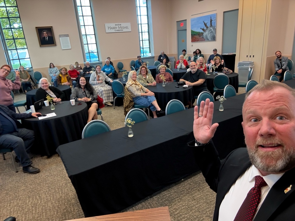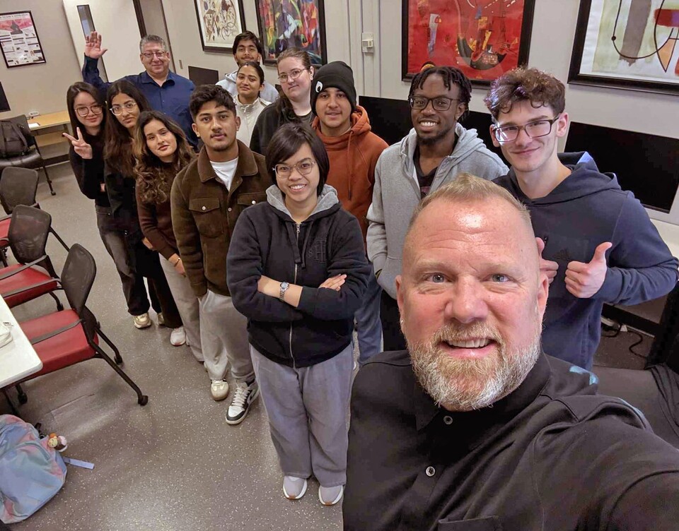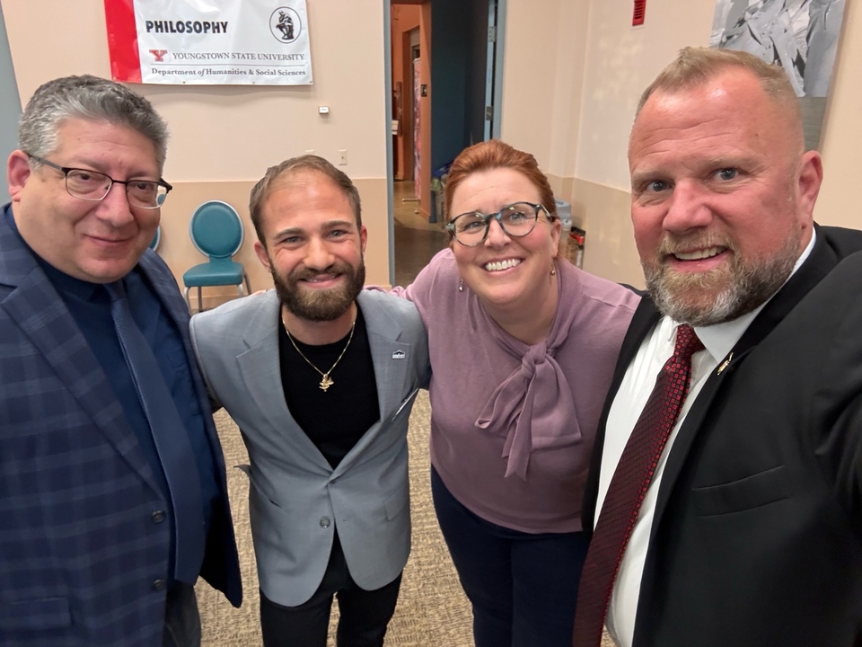 Andrew Och with Dr. Jay Gordon and his YSU freshman English class discussing