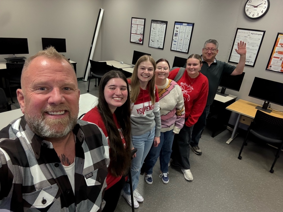 Andrew Och with YSU junior English students and Dr. Jay Gordon discussing First